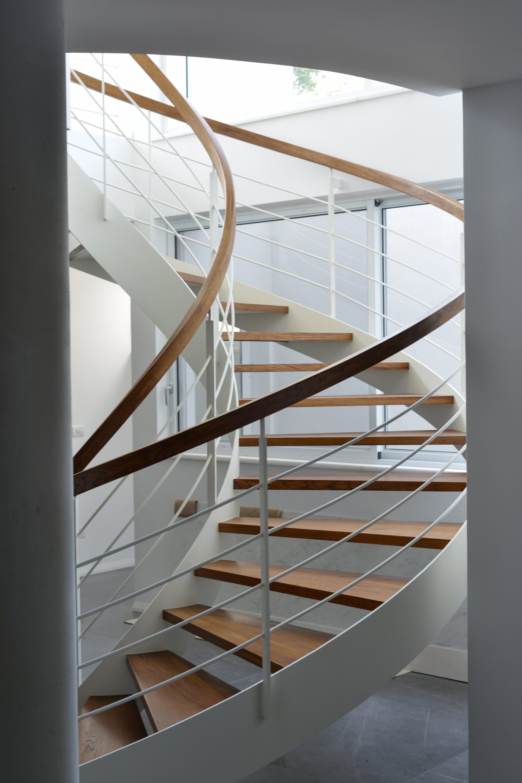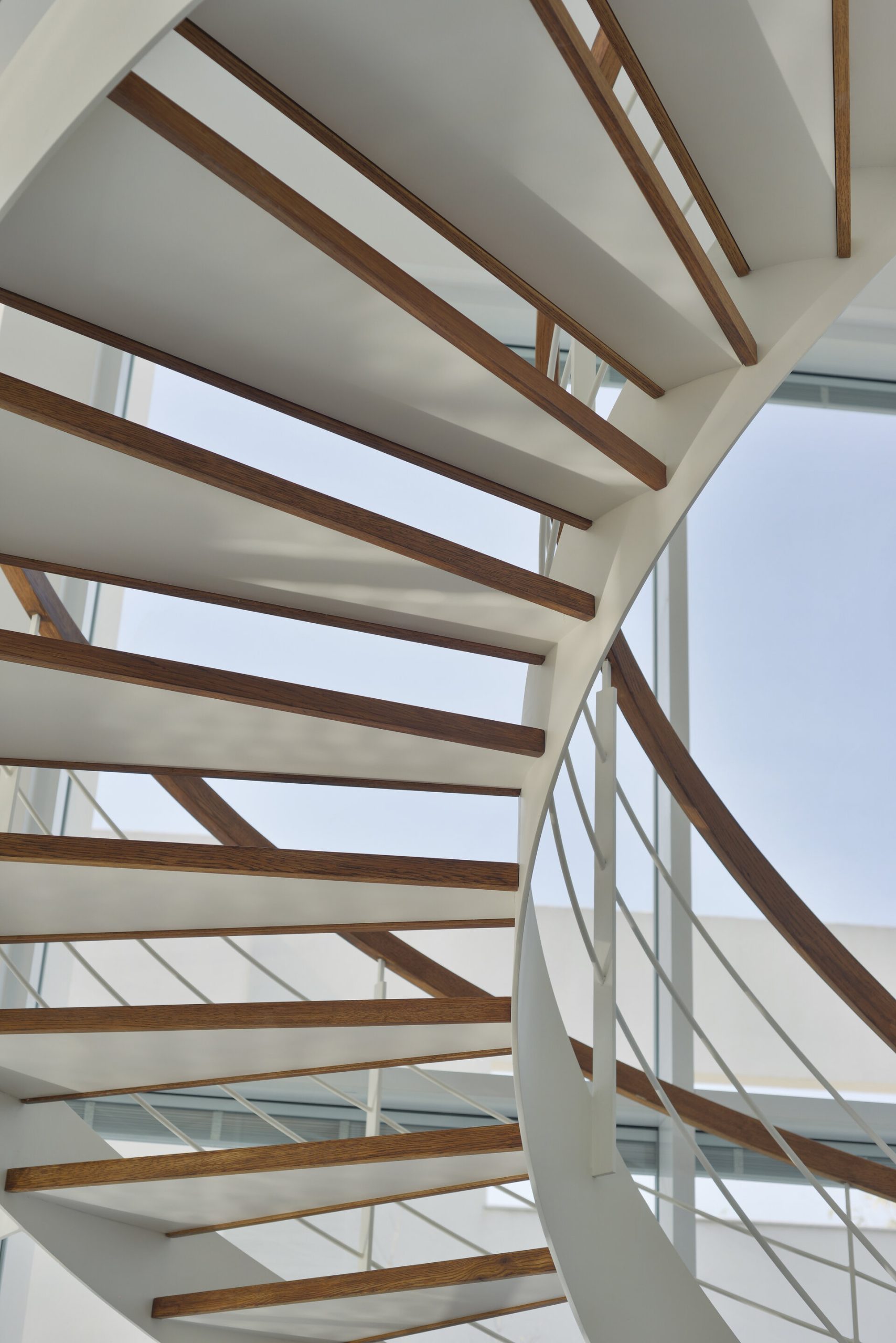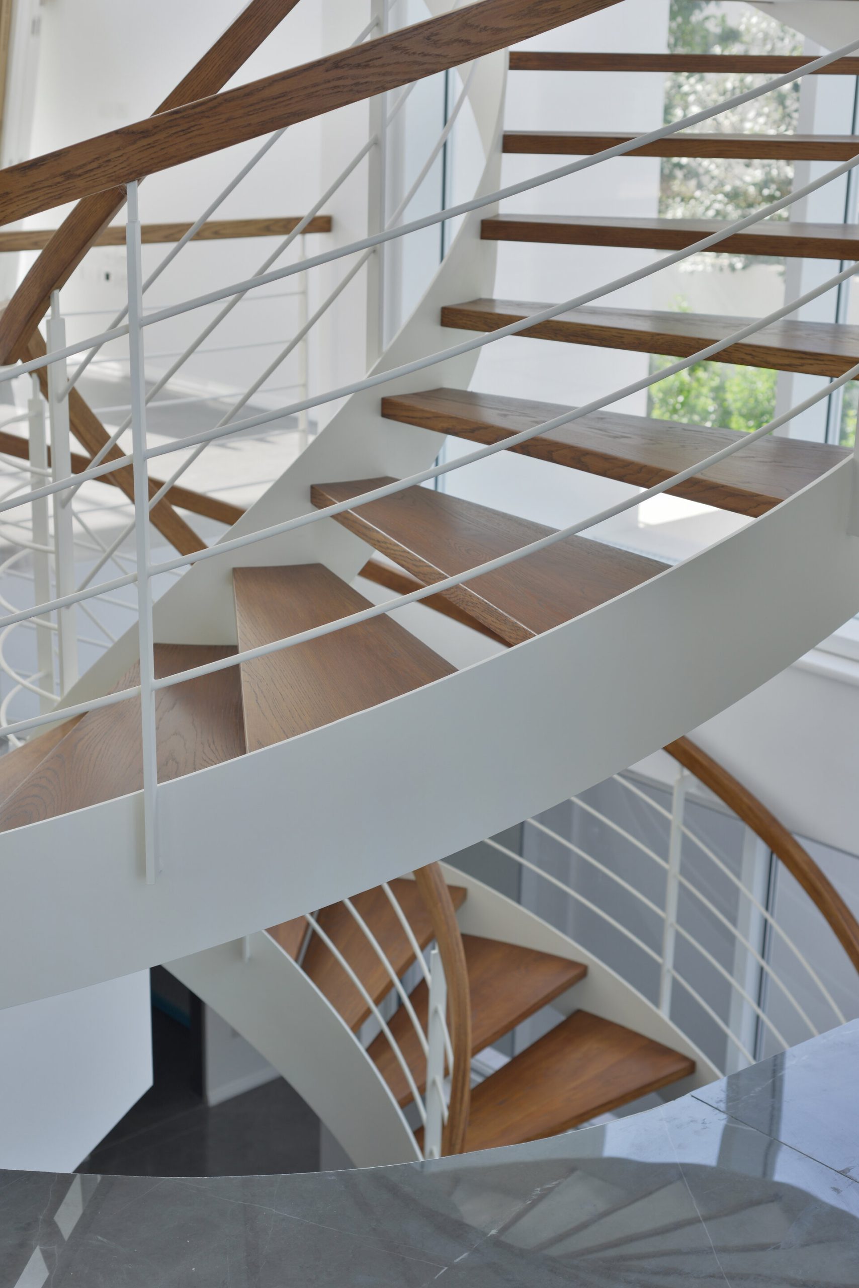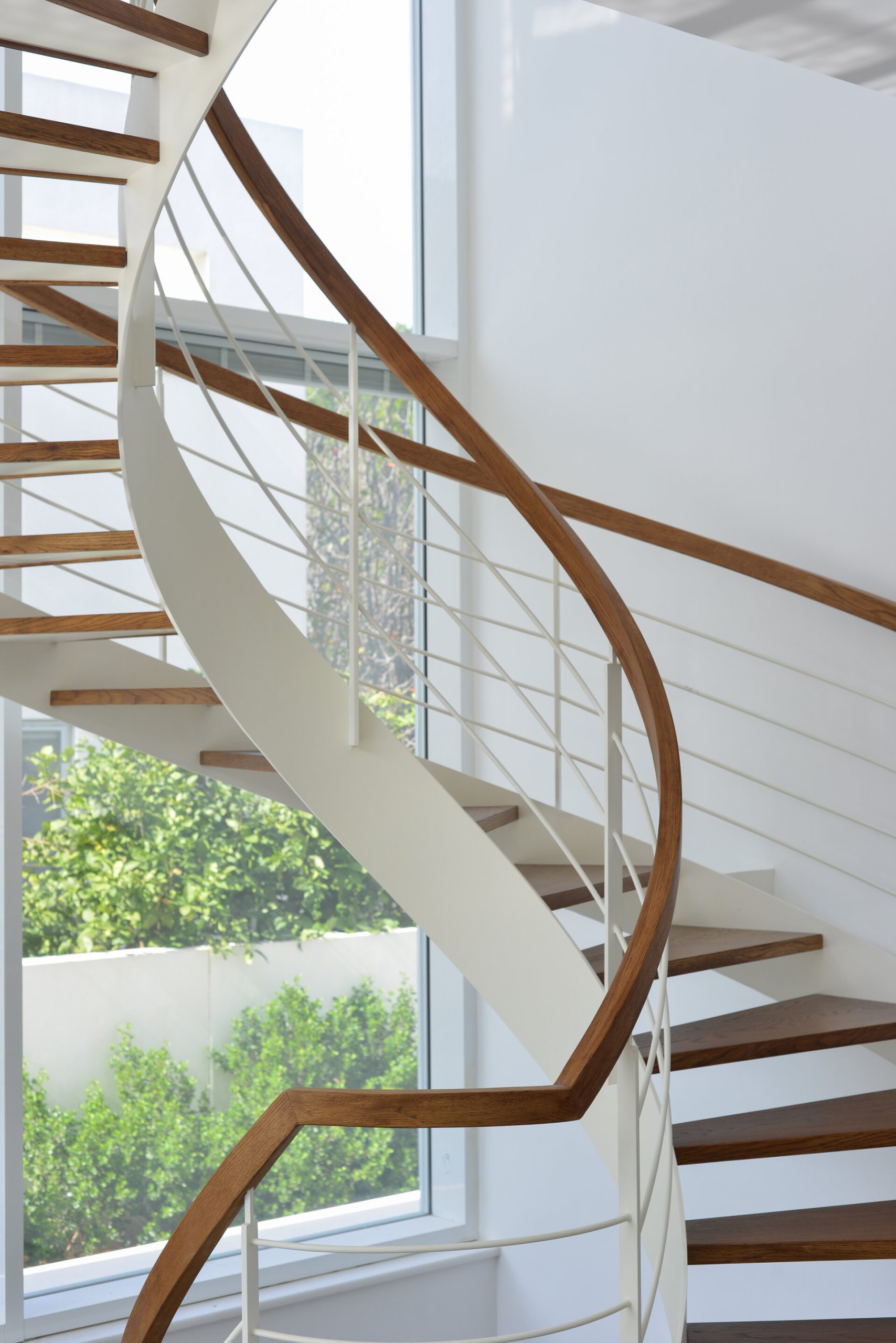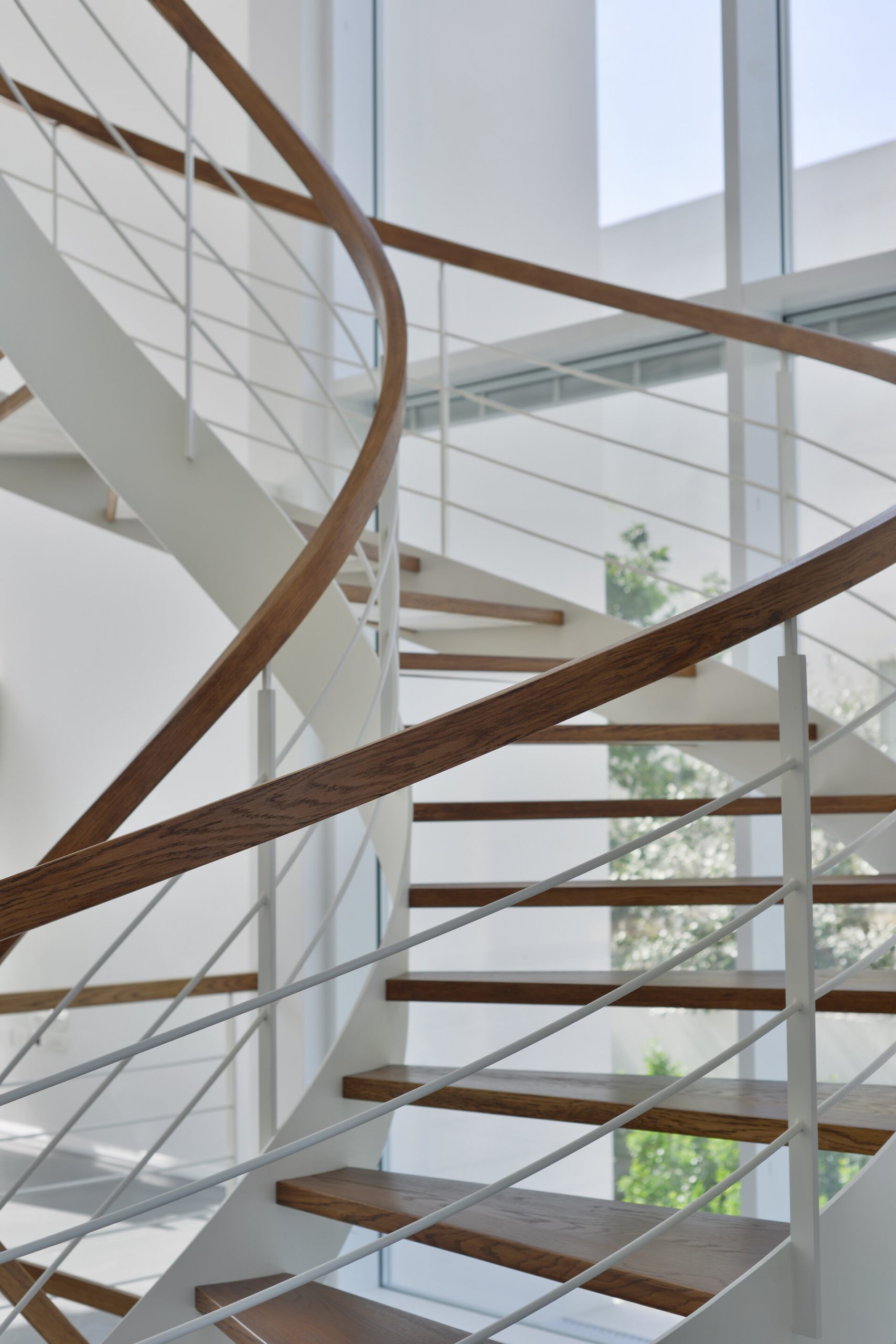 פרויקט מדרגות בהרצליה פיתוח - יגאל יקיר: מדרגות בקונסטרוקציה ספירלה מברזל ועץ אלון אמריקאי ספירלה
