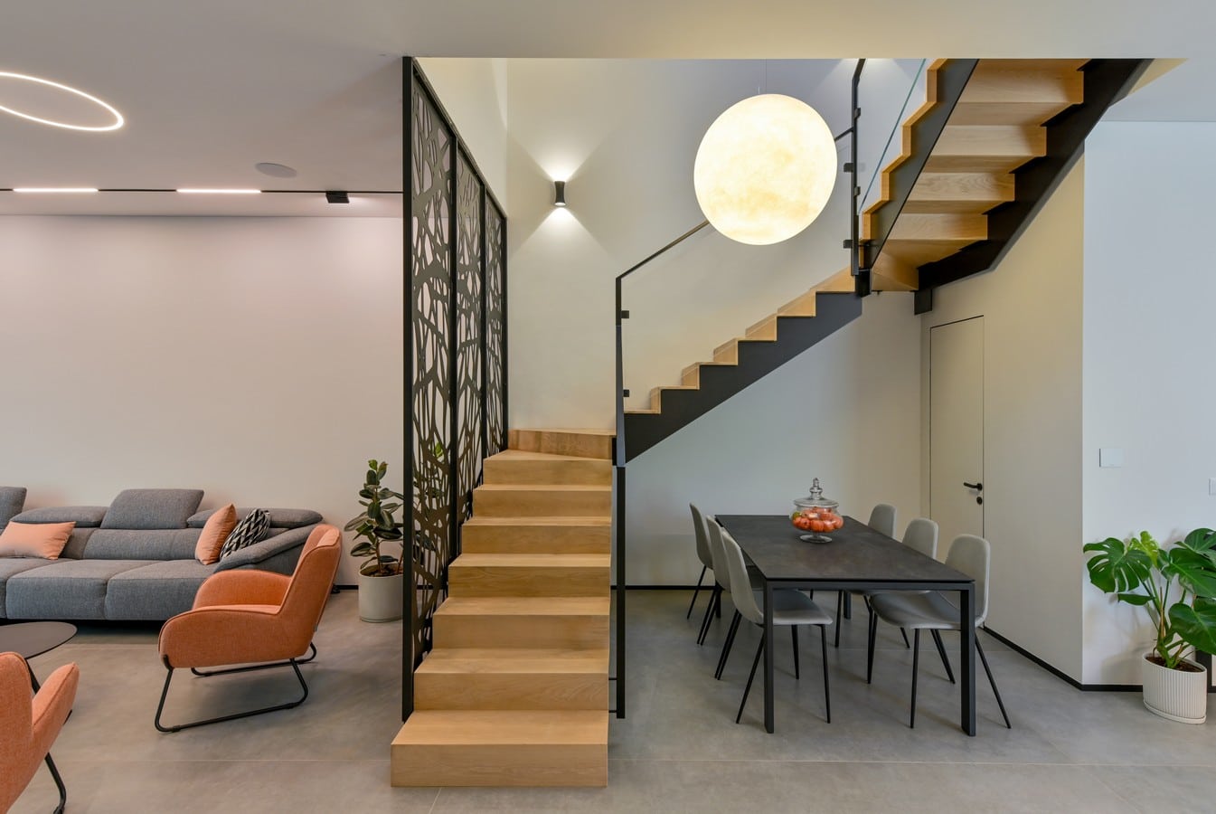 פרויקט בקריית אונו מדרגות ברזל בצבע שחור עם חיפוי רום ושלח מעץ אלון אמריקאי