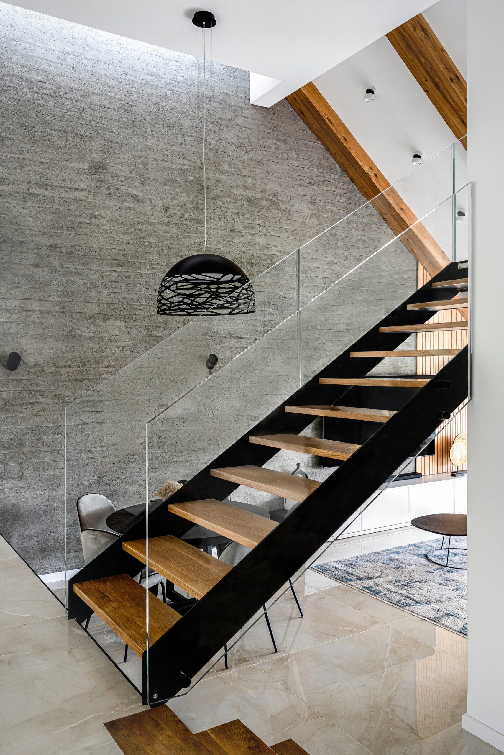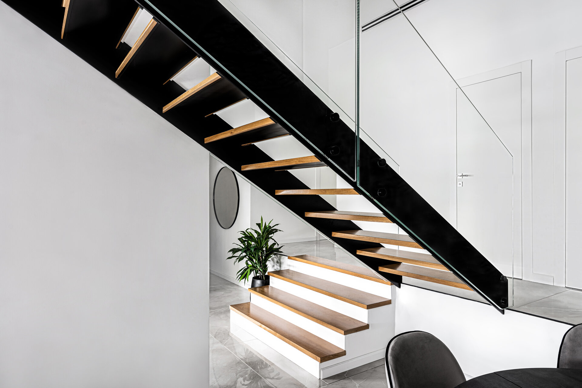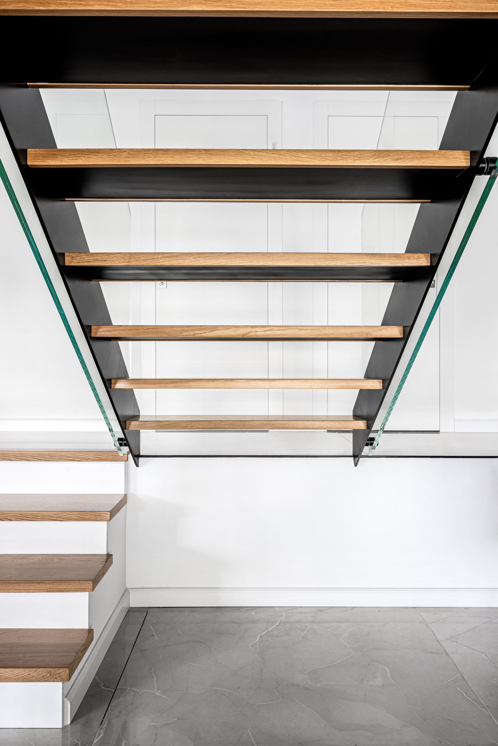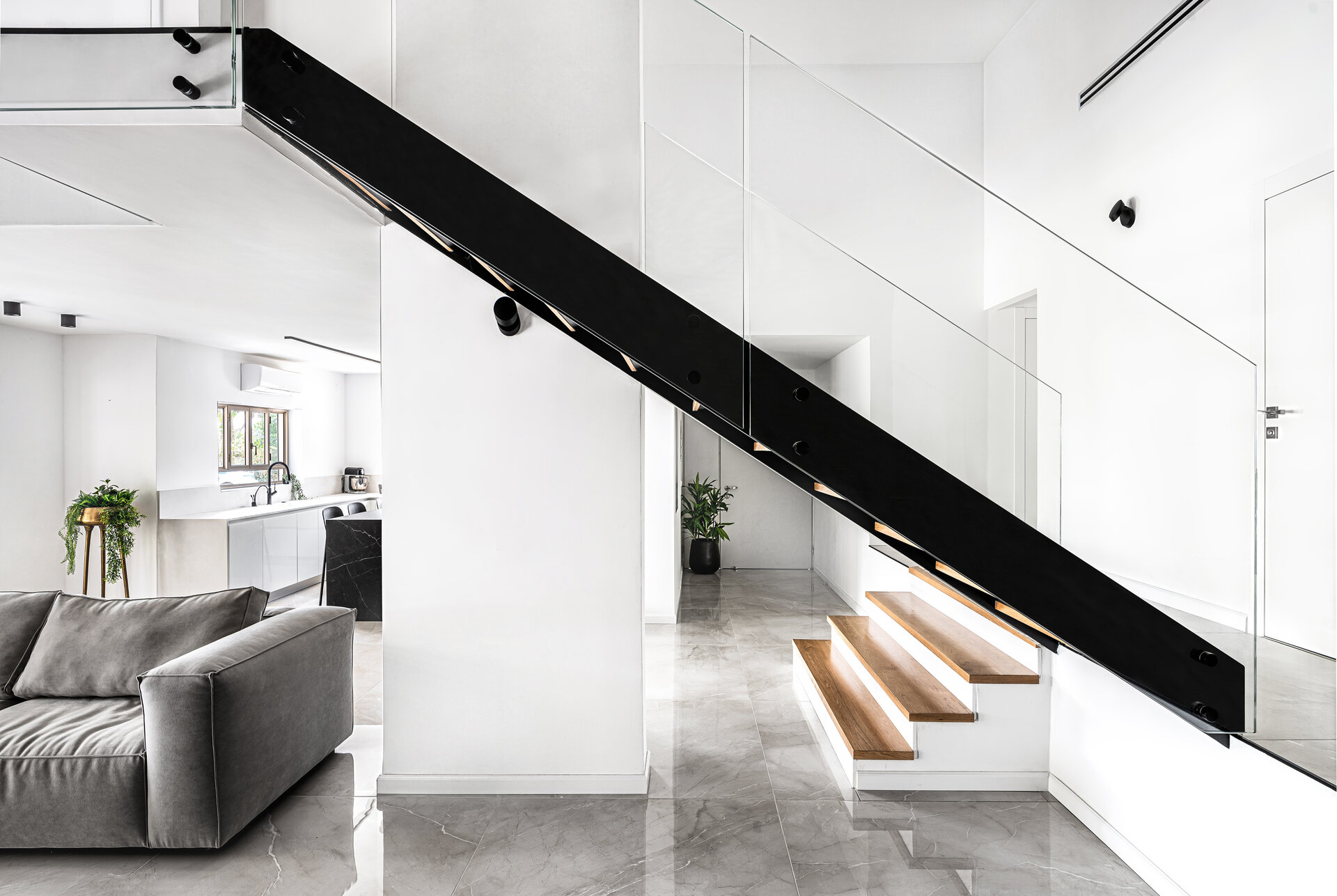 פרויקט מדרגות במכבים - דנה כהן: קומת מדרגות ברזל עם ציפוי עץ אלון אמריקאי ומעקה זכוכית אקסטרה קליר עם מנטים שחורים. מדרגות ראשונות ציפוי עץ אלון אמריקאי עם רומים לבנים.