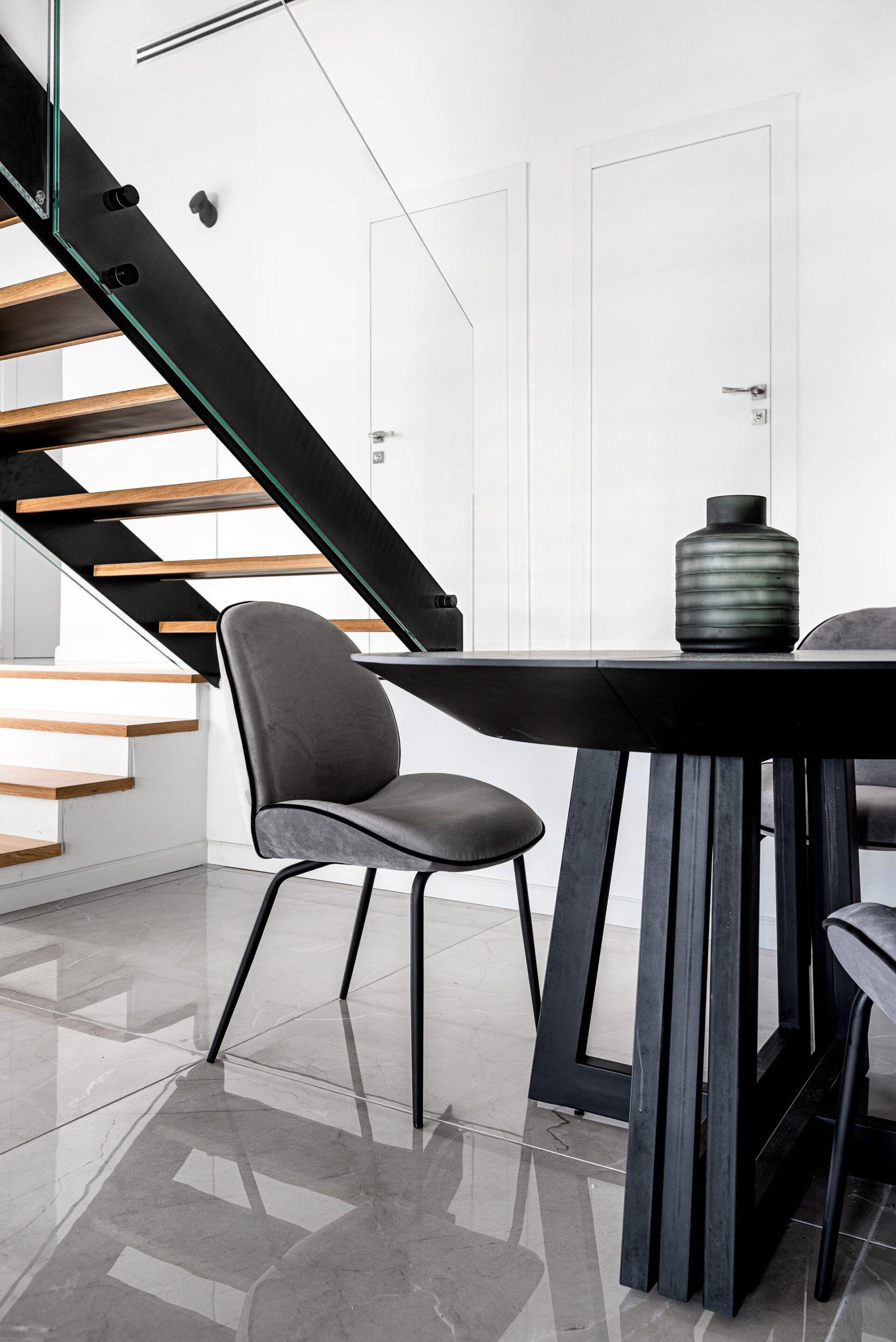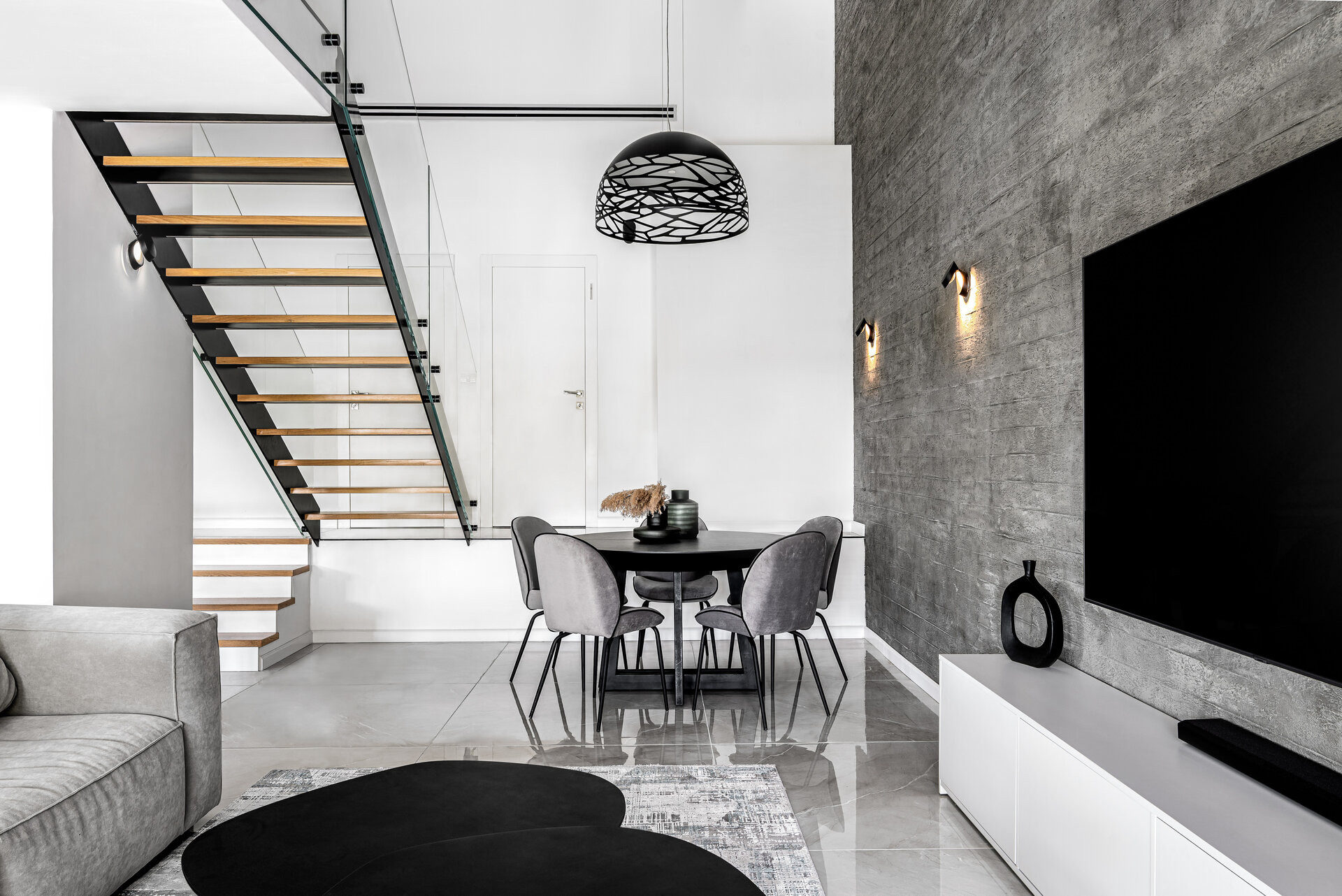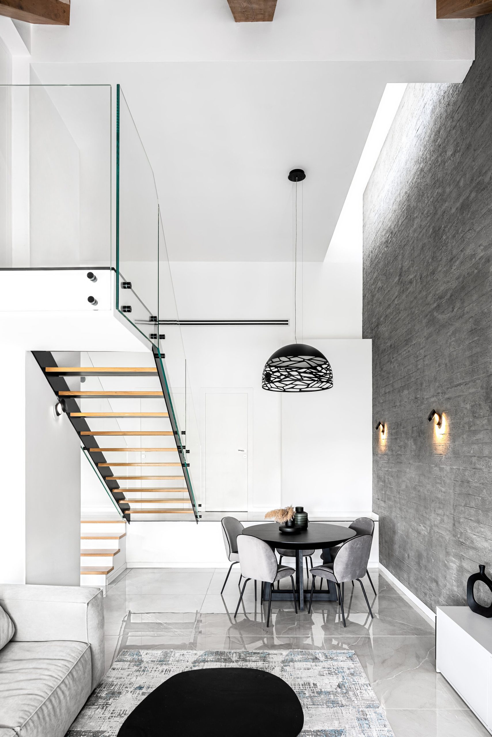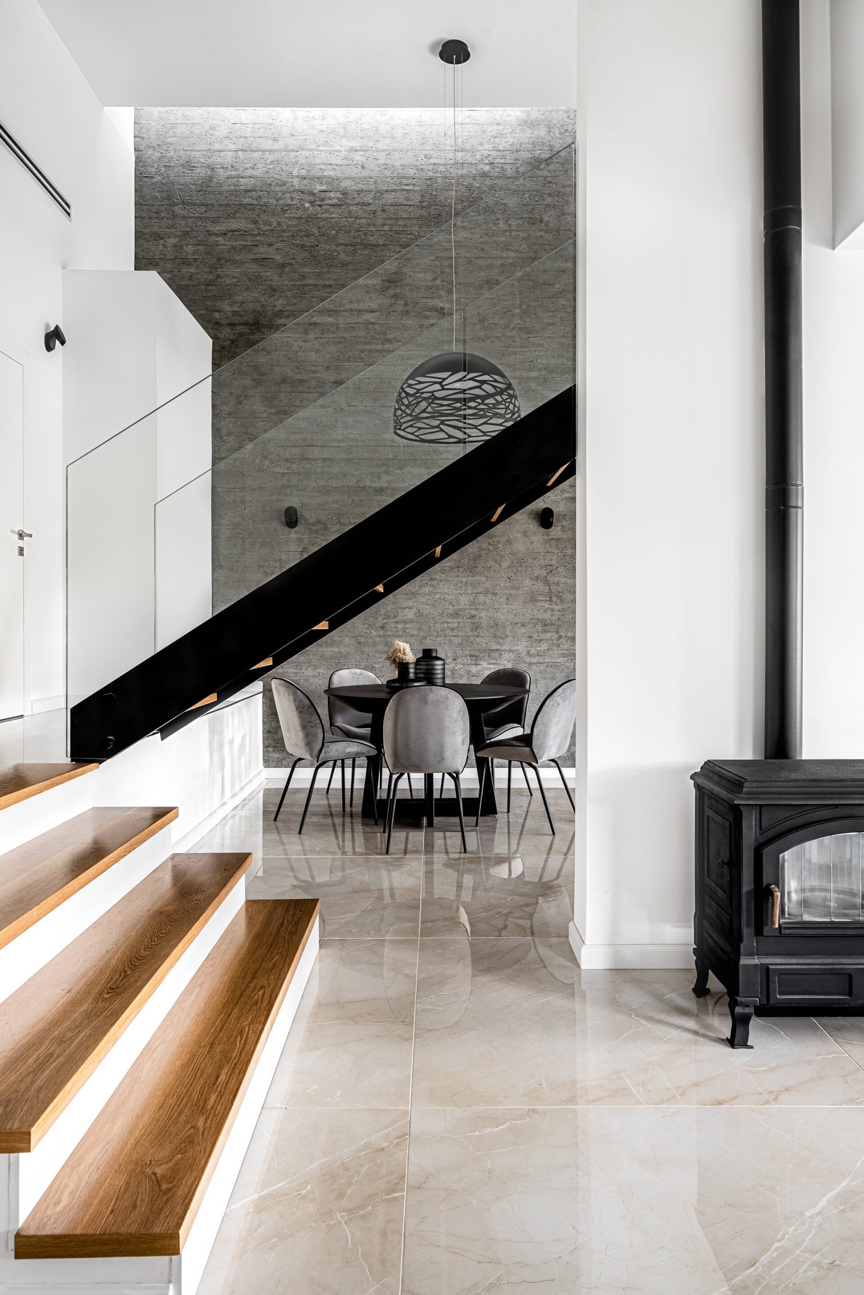 פרויקט מדרגות במכבים - דנה כהן: קומת מדרגות ברזל עם ציפוי עץ אלון אמריקאי ומעקה זכוכית אקסטרה קליר עם מנטים שחורים. מדרגות ראשונות ציפוי עץ אלון אמריקאי עם רומים לבנים.