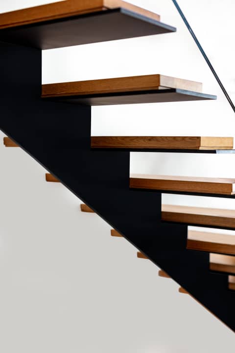 פרויקט מדרגות ברמת גן - מירב טוויג: מדרגות ברזל עם ציר מרכזי דק ומדרגות ברזל שחורות תפוסות בצורה נסתרת ועליהם עץ אלון אמריקאי עם מעקה ברזל וזכוכית