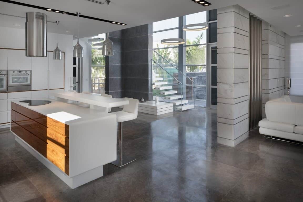 פרויקט מדרגות מרחפות מקוריאן לבן בצורת קופסא ומעקה זכוכית 15 קליר