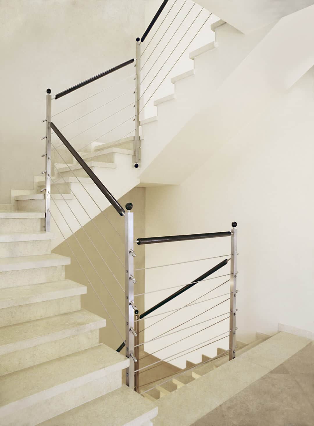 מעקה כבלי נירוסטה עם עמודי נירוסטה וידית מעץ