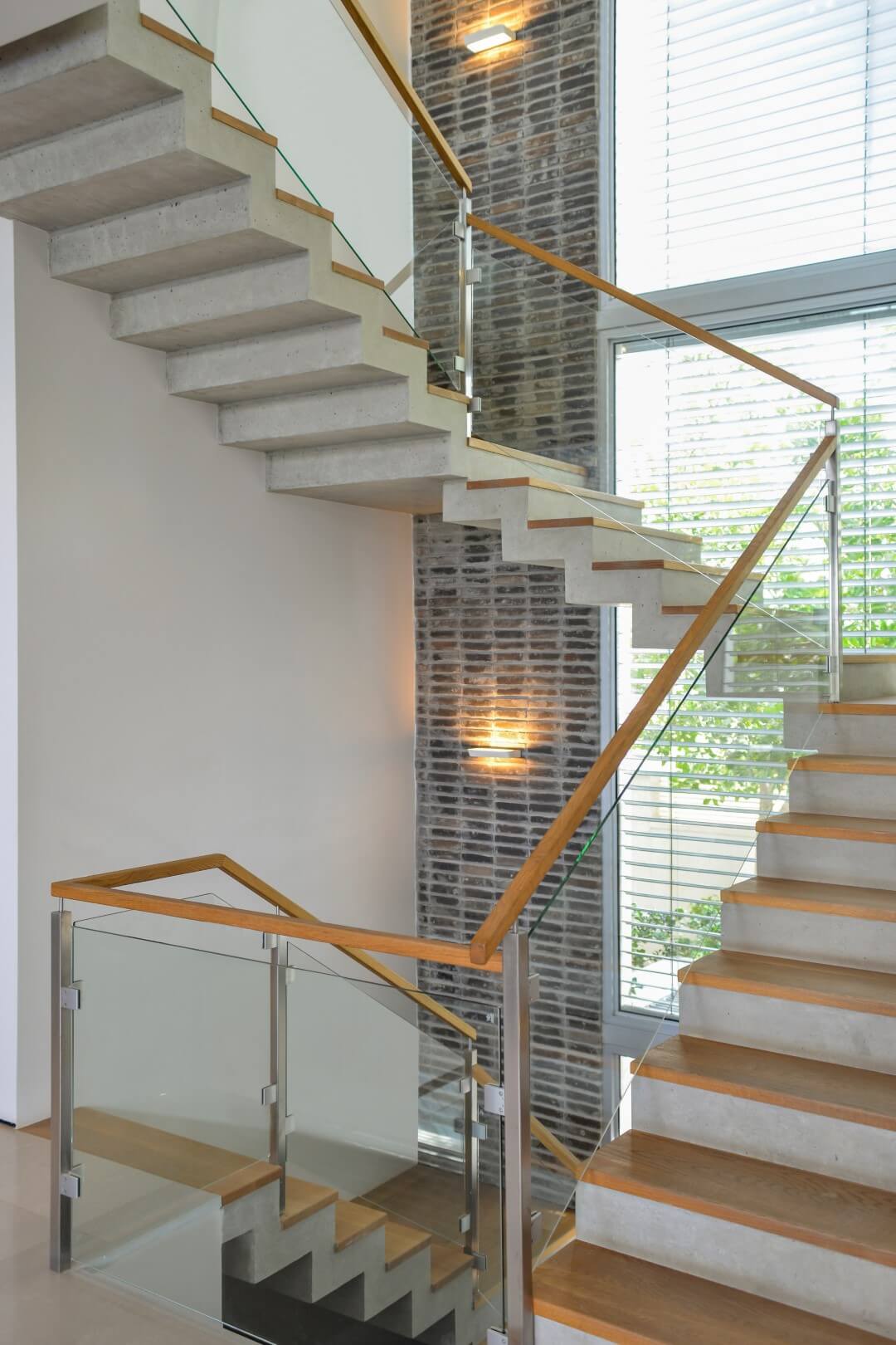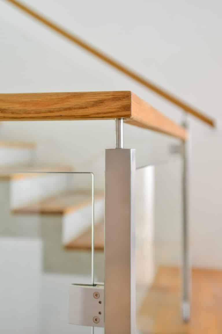 מדרגות עץ אלון אמריקאי על בטון שלחים בלבד ומעקות עמודי נירוסטה זכוכית וידית עץ